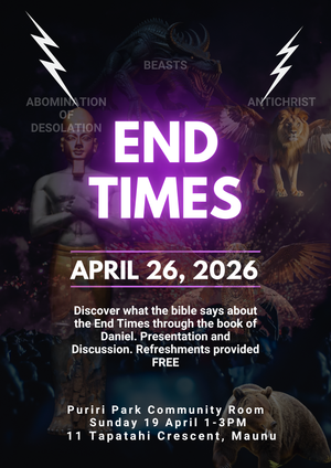 Discover the incredible prophecies of future events from the bible book of Daniel. Unlike other information you may have received, we try to only use the bible for the reference for these prophecies. I am sure you would not have heard of this biblical insight as it is not widely taught in New Zealand. However, it was the dominant view throughout the Christian church age that was lost through the noise of false teachers. There will be time for discussion and some refreshments will be provided.